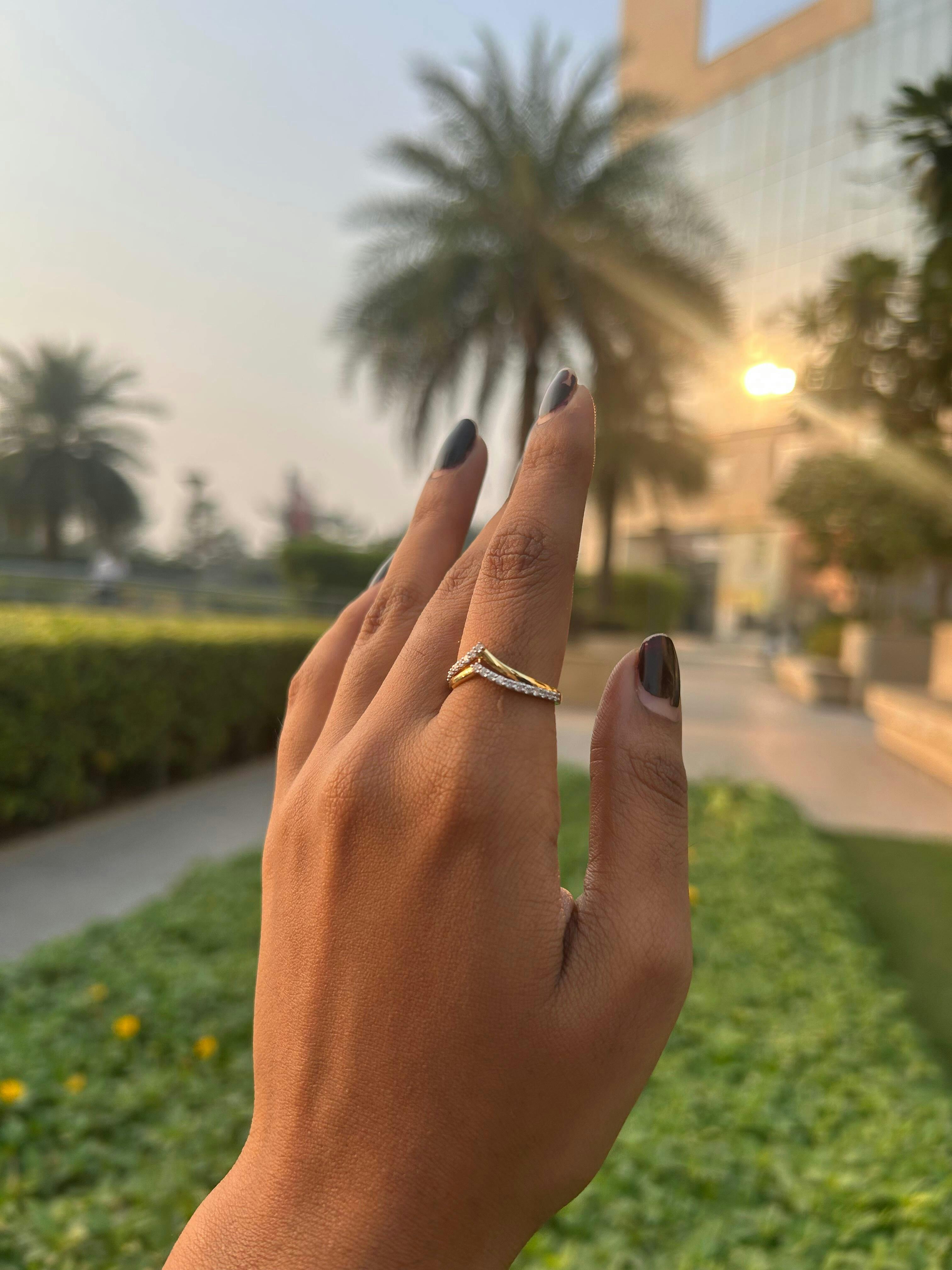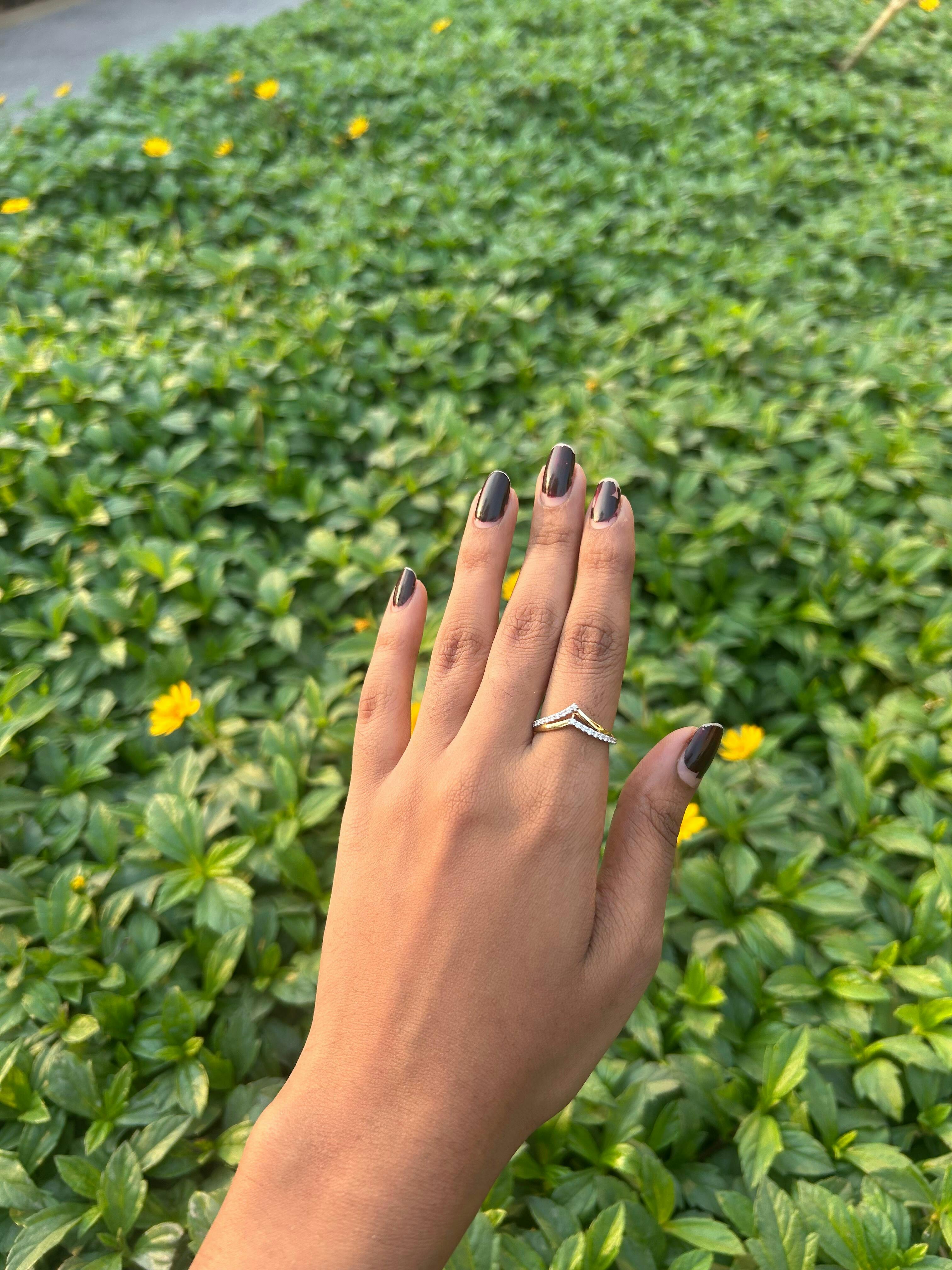 The Divine V Diamond Ring is a classic beauty. Inspired by the timeless "V" shape, it features duo row of diamonds elegantly set in a sleek setting. Perfect for everyday wear or special occasions, this versatile piece can be worn alone or stacked, adding a touch of sophistication and charm to any style.