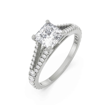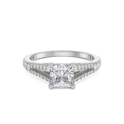 The ring features a split shank design, with both sides lined with pavé-set diamonds that add extra sparkle without overpowering the center stone. The gentle curves of the raised diamond setting blend perfectly with the clean geometry of the princess cut. Crafted in 14KT and 18KT white gold, the polished band highlights the center diamond, letting it take full focus.