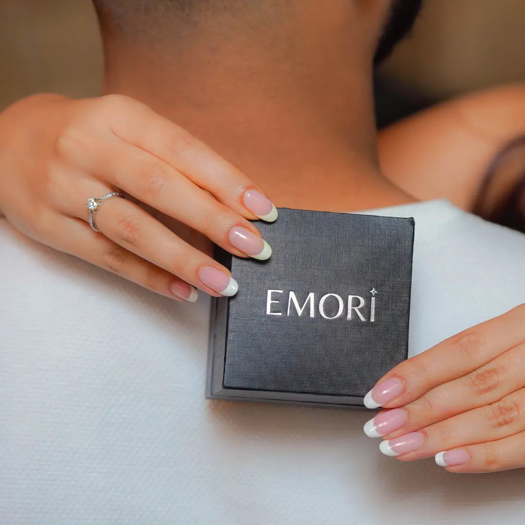 Indulge in a radiant classic allure with the Round Sidestones Engagement Ring by Emori. The beautiful ring features a 0.5 CT round cut lab-grown diamond settled in a secure 4-prong setting, excuding a timeless sparkling beauty. The white gold band is adorned with smaller round diamonds across the ring to illuminate an unmatched luxurious spark. Grab this article for cherishing a beautiful journey of love and commitemrnt with your special one.