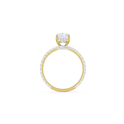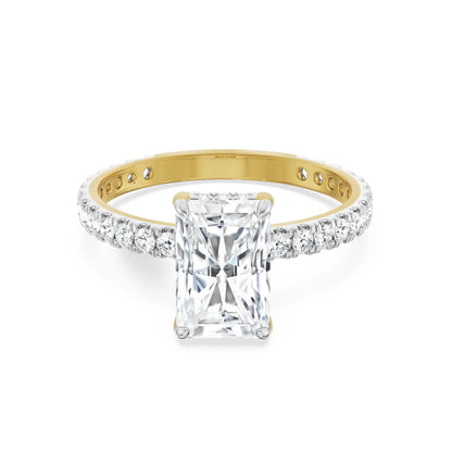Style your finger with a bold beauty, introducing the 2 CT Radiant Engagement Ring crafted by Emori. This ring features a 2 CT radiant cut lab-grown diamond in the center arranged in a 4-prong setting and detailed with a hidden halo of diamonds beneath the radiant diamond, adding an extra eye-catching feature to the ring. The yellow gold band is embellished with smaller round diamonds to complement the radiance of center diamond efficiantly. Shop the ring and cherish your engagement day with luxury and statement.