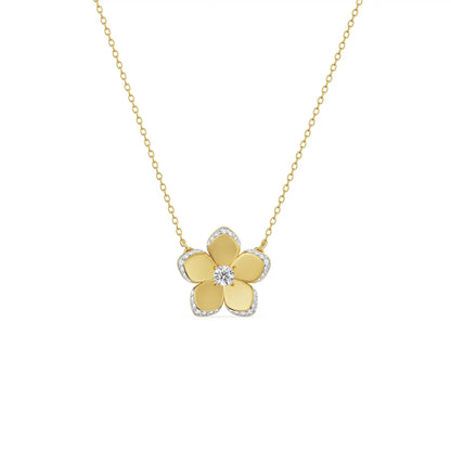 Introducing the Flora Blooming Diamond Necklace, a stunning piece crafted by Emori that captures the essence of a blooming flower. This neckpiece features a floral charm crafted while showcasing blooming flower petals made with hallmark yellow gold and detailed with 0.3 CT round cut lab-grown diamonds from the center and the edges of the flower. This beauty is followed by a sleek yellow gold chain that effortlessly sits on your neckline and engages it in a nature-inspired luxury. Whether you are heading for a casual lunch with friends or elevate your professional look, this necklace is the perfect choice for you.