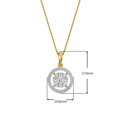 Presenting a stunning fusion of three different diamond cuts in one pendant, the Glistening Diamond Pendant by Emori. The stunning article features a princess cut lab-grown diamond in the center encircled by sparkling marquise diamonds and complemented by a spaced halo adorned with brilliant round diamonds, completing the harmonious balance of three diamond cuts. The hallmark yellow gold chain carrying this pendant engages your neckline in a warm luxurious grace. This pendant id perfect to be styled daily or with professional outfits to enhance your everyday elegance.