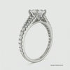 The ring features a split shank design, with both sides lined with pavé-set diamonds that add extra sparkle without overpowering the center stone. The gentle curves of the raised diamond setting blend perfectly with the clean geometry of the princess cut. Crafted in 14KT and 18KT white gold, the polished band highlights the center diamond, letting it take full focus.
