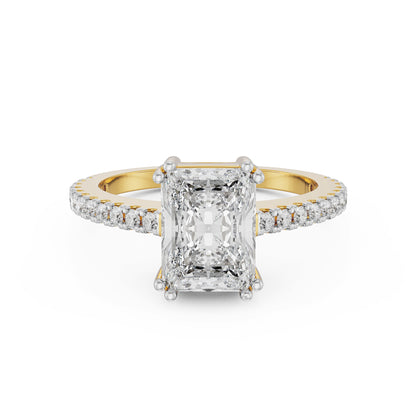 The Radiant Cut Engagement Ring is a testament to refined elegance. At its center, the ring features a mesmerizing emerald-cut diamond, chosen for its captivating clarity and distinctive shape. These side stones enhance the overall brilliance of the central gem, adding a touch of opulence.Ideal for vintage-inspired or classic bridal looks. Pair with lace or satin dresses to enhance the vintage appeal.