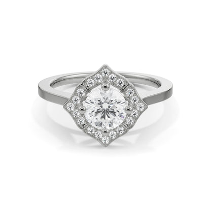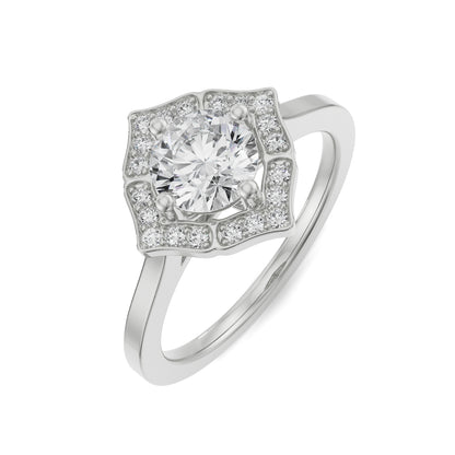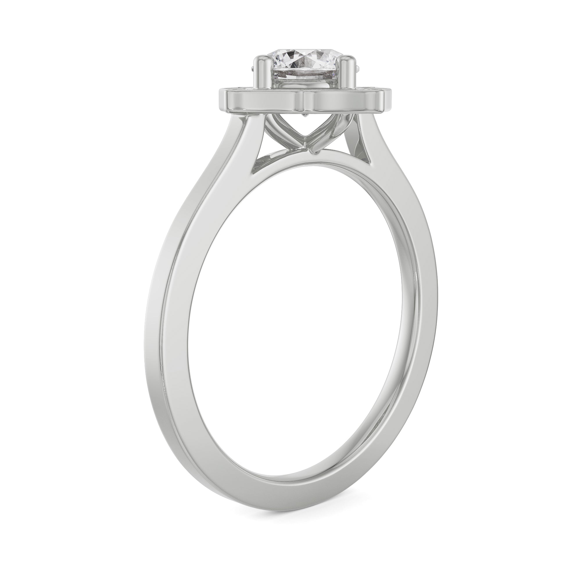 Unlock elegance with beautifully crafted articled by Emori, the Round Stone Halo Engagement Ring. This ring features a 0.67 CT round cut lab-grown diamond settled in a traditional prong setting, complemented by a leafy halo engraved with starry diamonds to engage a sparkling look with a blend of nature's beauty. The sleek white gold band allows the sparkling pattern to gain the spotlight without overwhelming it. The ring is perfect for adding glam to your date night outfit or formal occasion.
