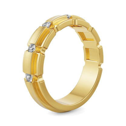 The Septet Wedding Band for Men is a perfect ring with a unique blend of sophistication and thoughtfulness. The chain-like structure embarked with a sunshine yellow gold band is engraved with seven sparkling round cut lab-grown diamonds. Seven represents many aspects of life, a perfect number that symbolizes completeness or perfection which acts as a special point of reference with wedding celebrations. This band is a classic approach to any refined look.