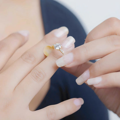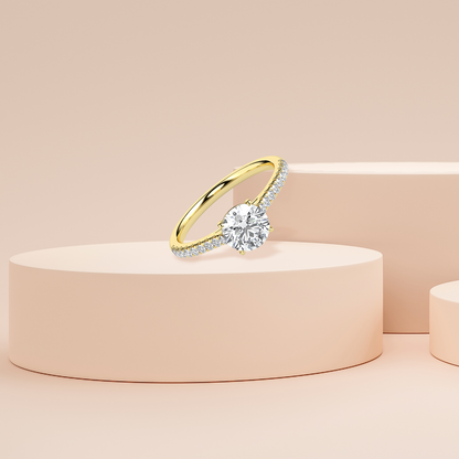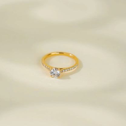 Introducing the mesmerizing art crafted with perfection, the Sparkling Solitaire Diamond Ring by Emori. The enchanting ring features a 0.73 CT round cut lab-grown diamond settled in a spotlight, flaring a perfect sparkling brilliance. The luxurious yellow gold band engraved with smaller round diamonds embodies timeless elegance. The ring is perfect for those who appreciate classic accessories with a little extra sparkle.