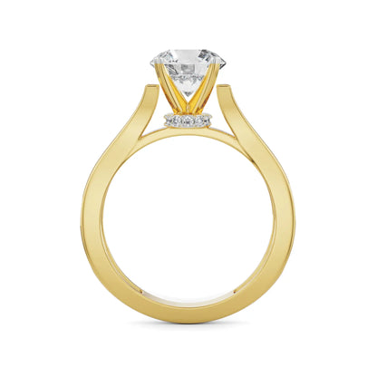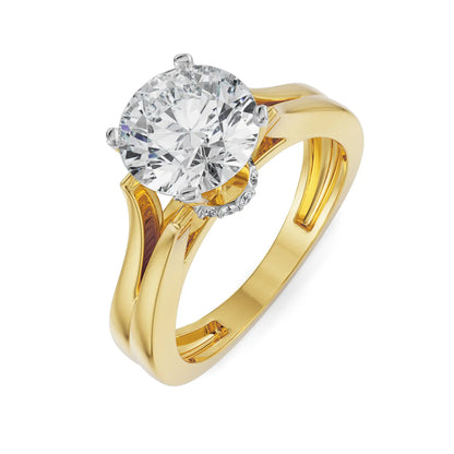 Take a look at the mesmerizing epitome of minimalist elegance, the Victoria Diamond Ring by Emori. The subtle ring features a bold 1.52 CT round cut lab-grown diamond in the center, complemented by a hidden halo studded with smaller diamonds, adding a striking detail to the ring's beauty. The sleek split shank setting of the yellow gold band allows the diamond to take center stage with a spotlighting charm without overwhelming the dazzle of the diamond. For formal events or evening occasions, this ring is perfect to enhance any outfit efficiently.
