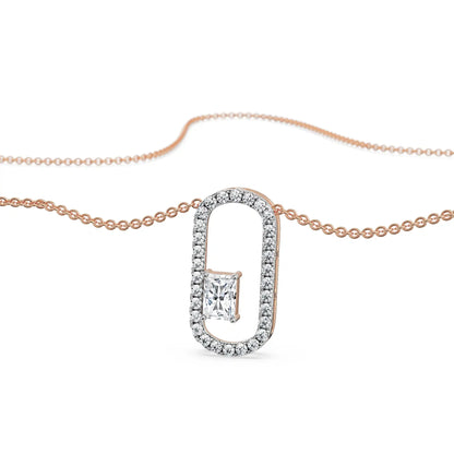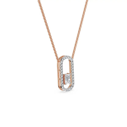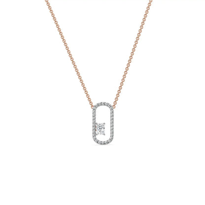 Zavya Lab Grown Diamond Necklace by Emori consists of an elongated, rounded rectangular frame encrusted with lab grown diamonds surrounding a central, vertically set radiant diamond. Suspended from a delicate chain and set in rose gold, this article is suitable for a fun outing with your girl gang.